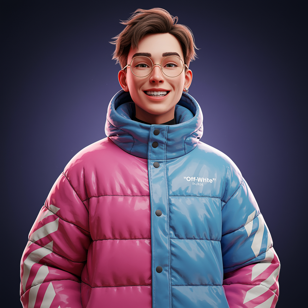 A young smiling man wearing a vibrant poncho oversized puffer jacket, influenced by Off-White and Tumblr aesthetics, with a touch of Yanjun Cheng's style. This digital art piece captures the essence of a lo-fi internet meme, echoing trends featured on Dezeen. The catalog-style illustration, reminiscent of a 3D render by Beeple, incorporates artistic elements from Rhads and Lois van Baarle, presenting a cartoon-style depiction in bright, eye-catching colors. The artwork, inspired by retro anime, portrays a youthful character with a modern, stylish twist, creating a visually striking and beautifully composed image.