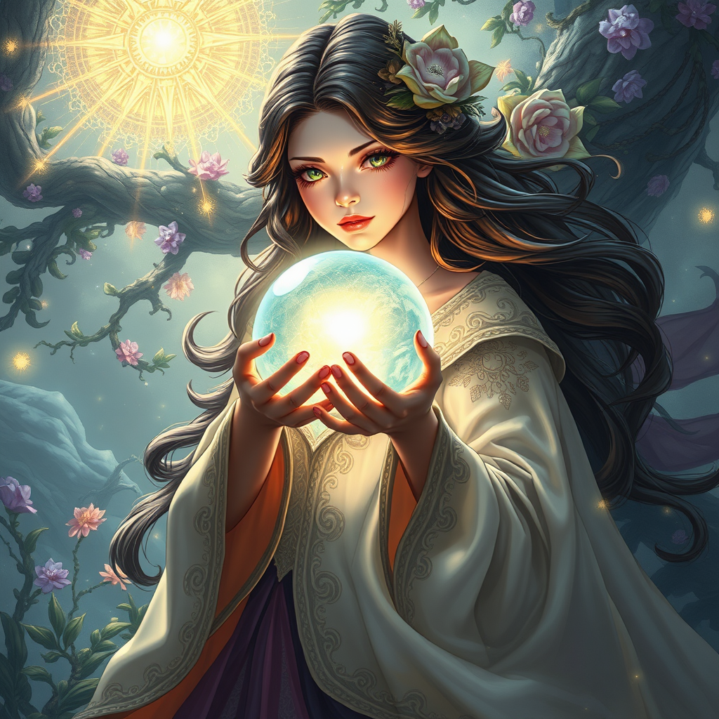 A young sorceress in an intricate flowing gown cradles a shimmering globe that radiates with ethereal light, embodying earth goddess mythology. The realistic fantasy illustration captures her serene yet powerful presence, surrounded by mystical foliage and vibrant celestial elements. Her eyes reflect the wisdom of ages, reminiscent of an anime fantasy illustration. The artwork, inspired by Artgerm and Atey Ghailan, adopts a style akin to Guweiz, featuring delicate lines and a depth of emotion, creating a magnificent digital fantasy painting that exudes beauty and wonder.