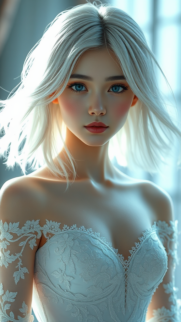 A young South Korean girl with flowing medium-length white hair, showcasing a highly detailed face reminiscent of the styles of Greg Rutkowski and Magali Villeneuve. She is adorned in an elegant wedding dress, her beautiful eyes capturing a sense of mystery and allure. Her figure is gracefully toned, with a hint of delicate beauty. The scene is bathed in cinematic lighting, highlighting the hyperrealism of her features. Rendered in 8k UHD 3D, the depiction has a doll-like elegance. The setting and atmosphere may hint at imperfections, with elements of abstraction in anatomy, creating a surreal and artistic interpretation that embraces the beauty within the imperfect.