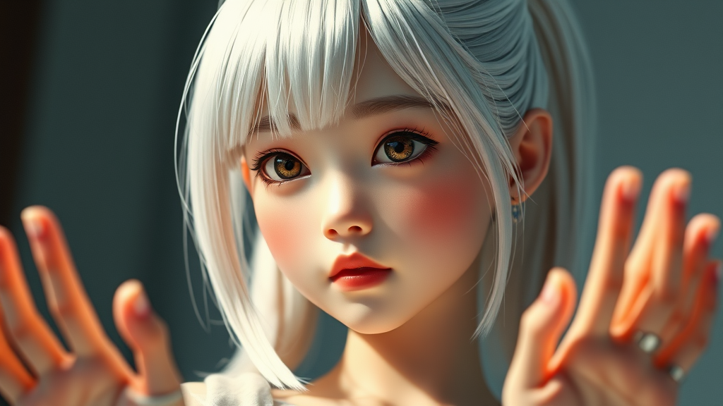 A young South Korean girl with medium-length white hair styled in a sleek ponytail, her highly detailed face illuminated by cinematic lighting. Her beautiful eyes contrast with a sculpted, toned body. The rendering evokes a 3D doll-like quality, capturing fine details while balancing elements of artifice. Although her delicate features are well-rendered, aspects such as hands, partially out of frame, exhibit imperfections with occasional disfigurations. The depiction maintains an ethereal, surreal atmosphere, subtly hinting at the contrast between perfectly crafted and abstract, dream-like imperfections.