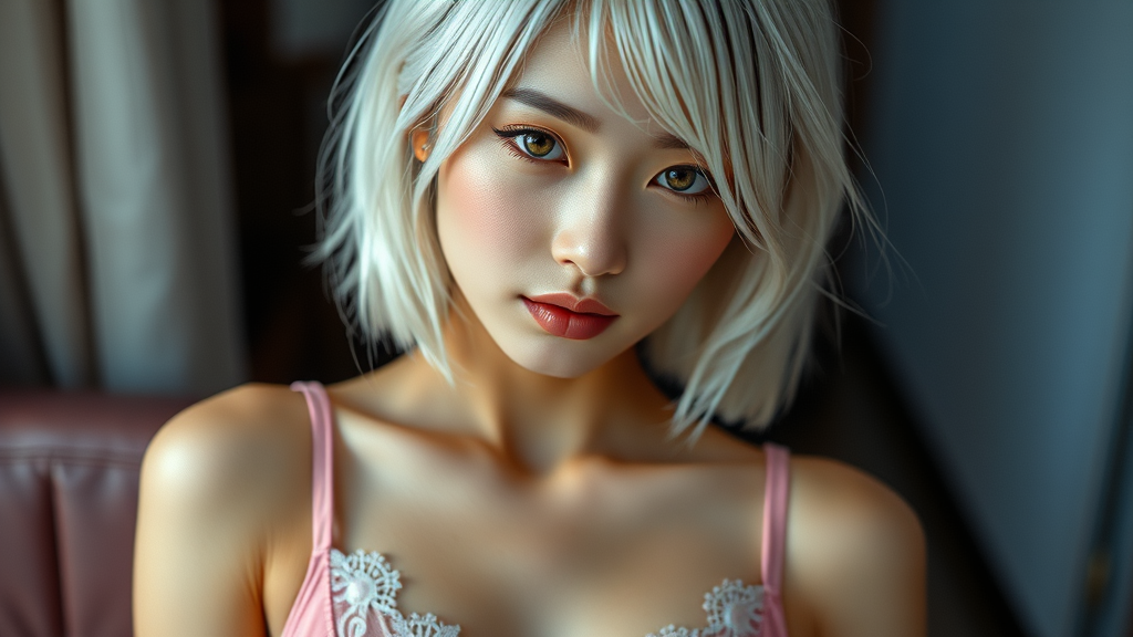 A young South Korean girl with medium-length white hair and a proportional, toned body wears elegant pink lingerie. She has a highly detailed and beautiful face with captivating eyes, captured in a high-detail, ultra-high-resolution RAW color photo. The image uses cinematic lighting and depth of field to enhance realism, resulting in a hyper-detailed, lifelike texture. The photo is a photorealistic masterpiece, featuring realistic skin textures and rich colors. Shot with a Nikon D850 camera on a Kodak Portra 400 film stock, the f1.6 lens ensures sharpness and high contrast. The lighting is dramatic, resembling physics-based rendering, while still presenting a clean, polished digital art style trending on Artstation. The background complements the model with a seamless blend, resulting in a unified 8K wallpaper feeling. The image masterfully avoids imperfections like blemishes, bad anatomy, or poor composition, maintaining visual harmony and exceptional quality.