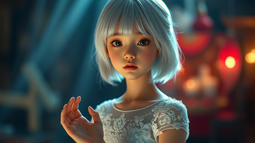 A young South Korean girl with medium-length white hair stands gracefully in a detailed wedding dress, her eyes captivating and beautifully rendered, reflecting the hyperrealistic style of Greg Rutkowski and Magali Villeneuve. Her small yet elegant physique is highlighted by the intricate design of her attire. The scene is enveloped in cinematic lighting, enhancing the 8k uhd 3d quality of the image. Despite the doll-like perfection, subtle distortions play with the composition: her hands are somewhat abstract, fingers slightly irregular, suggesting an artistic interpretation. The essence is ethereal and dreamlike, with elements of surreal artistry woven into the rich, visual tapestry.