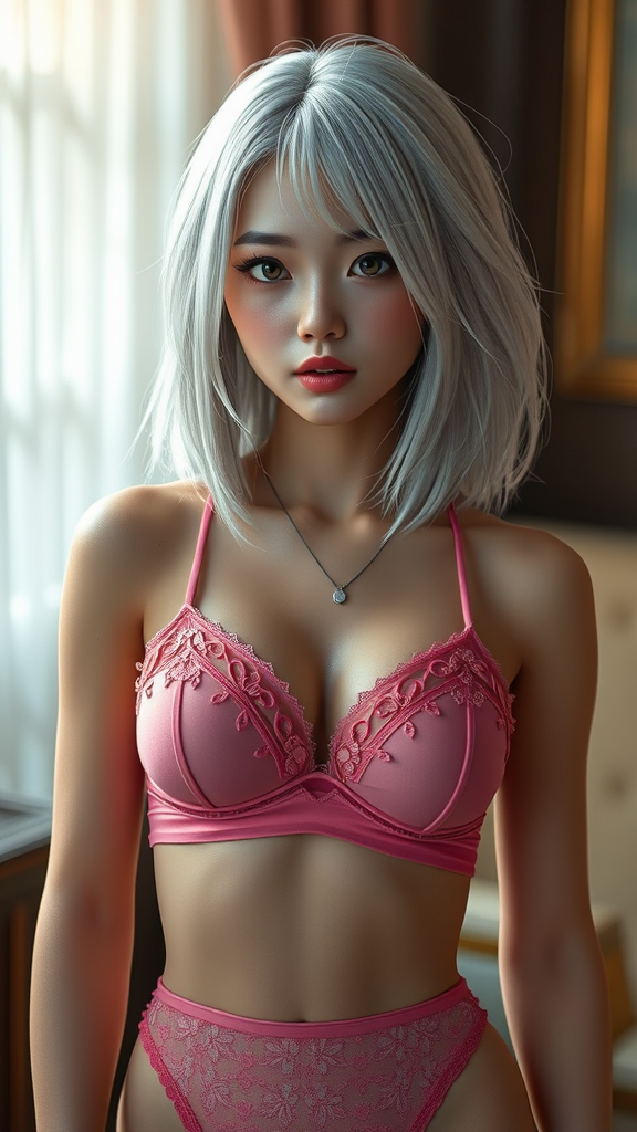 A young South Korean girl with medium-length white hair wearing elegant pink lingerie, featuring a proportional and toned body, a highly detailed face inspired by Greg Rutkowski and Magali Villeneuve, captivating eyes and cinematic lighting. Depth of field and 3D photography create a doll-like appearance. Octane render enhances the scene, subtly incorporating intentional imperfections such as blurry elements, extra limbs and fingers, poorly rendered hands, and slight deformations for a surreal and artistic impact.