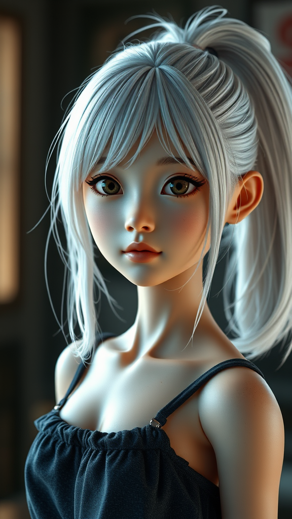 A young South Korean girl with medium-length white hair and a toned physique stands in cinematic lighting. Her highly detailed face features beautiful eyes, yet minor imperfections add a touch of realism. Her hair is styled in a ponytail, enhancing her unique charm. The scene, with 3D render quality, captures her doll-like appearance, despite some elements like a slightly distorted anatomy or an out-of-focus background. The combination of delicate artistry and subtle flaws creates a visually intriguing portrait.