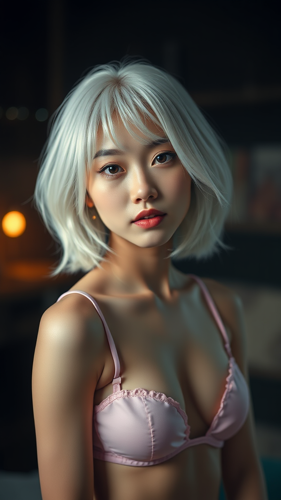 A young South Korean girl with medium-length white hair is wearing pink lingerie, showcasing a proportional and toned body. Her face is highly detailed, featuring beautiful eyes, set against cinematic lighting and depth of field, creating a dramatic photograph. This professional high-resolution image is captured with the rich color of a Nikon D850 using Kodak Portra 400 film stock at f1.6, resulting in hyper-realistic skin texture, lifelike details, and sharp focus. The scene, reminiscent of ultra-high resolution 8K wallpapers, embodies photorealism and realism, trending on Artstation for its masterful rendering. With a focus on realistic skin texture and fine details, every element in the image is crafted to perfection, capturing the essence of digital art and professional photography.