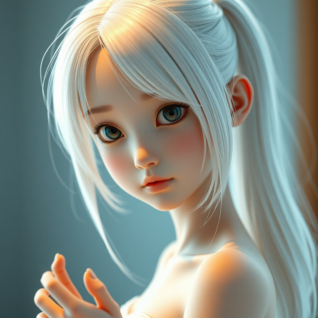 A young South Korean girl with medium-length white hair and a highly detailed face, featuring beautiful eyes, is depicted in cinematic lighting. She has a lithe, toned body and her hands are out of frame. Her long hair is styled into a ponytail, resembling a 3D render with doll-like quality. The image presents unique artistic interpretations, with slightly abstract anatomy, and dreamy, blurred elements creating an ethereal atmosphere.