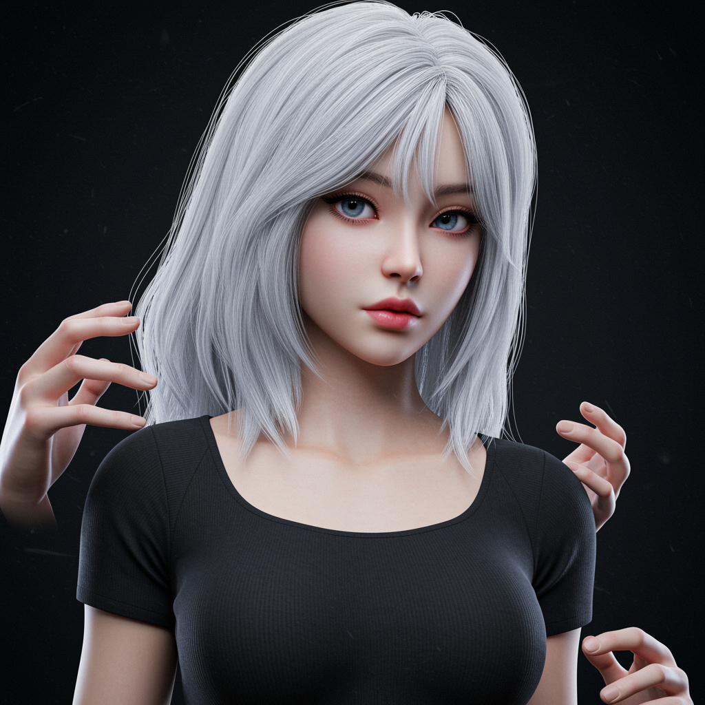 A young South Korean girl with striking medium-length white hair, featuring a highly detailed and captivating face. Her beautiful eyes complement her toned body and delicate features. The scene is lit with cinematic lighting that adds depth and drama. Her long hair is styled in a neat ponytail, contributing to her doll-like appearance. Despite the 3D rendering style, certain elements appear abstract, such as slightly exaggerated proportions and surreal hands, adding a unique artistic touch. The overall effect is a blend of fantasy and realism, inviting intrigue and curiosity.