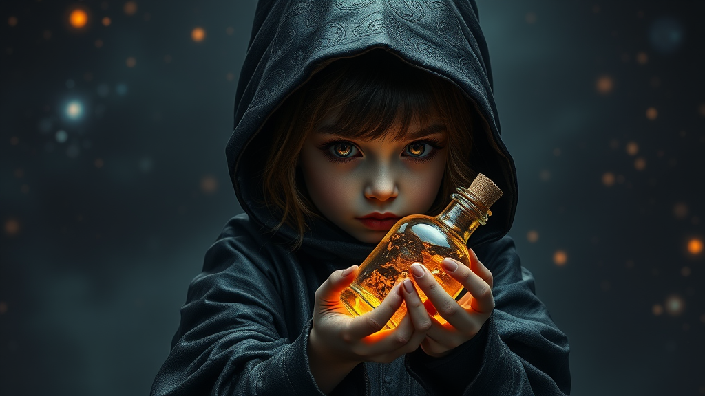 A young, unsettling girl with a hint of mischief, draped in an intricately patterned dark leather cloak, strikes a slow-motion dance-like pose. Her small hands delicately hold a mysterious, glowing potion bottle, as if conjuring a toxic spell. The background is a dark, moody universe, echoing with cosmic wonders, creating an intensely detailed scene. Every element is captured with stunning clarity, blooming with vibrant detail. Designed as a high-quality digital art piece, the image resonates with the style of Chao Teng Zhao, displaying an 8k photorealistic quality. Her face and eyes are extraordinarily detailed, with piercingly sharp pupils that enhance her enigmatic presence. Shadow and light intricately play across her perfect form, resulting in a 3D effect that enhances realism, delivering a masterpiece of concept art.