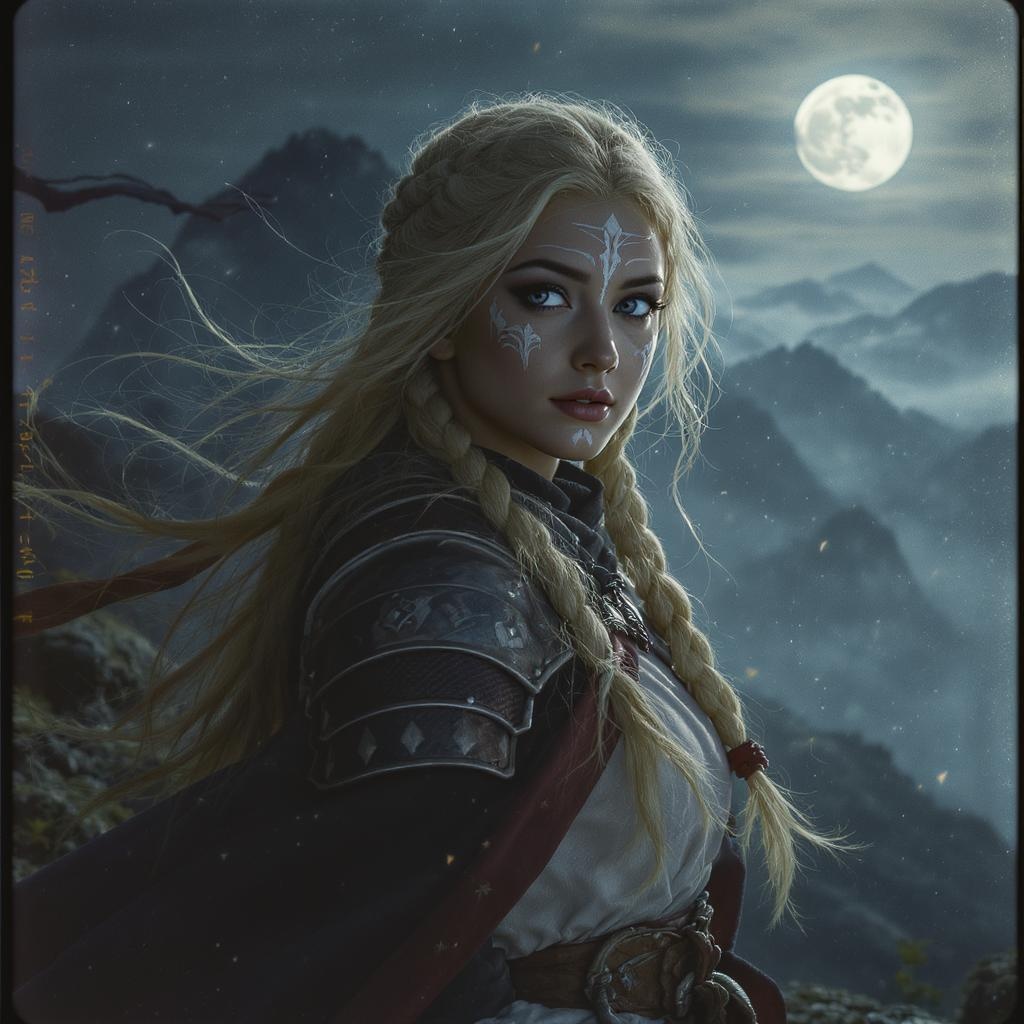 A young war princess stands confidently, her blonde hair intricately braided and flowing in the gentle breeze as a foggy mountain view sprawls behind her, partially obscured by enchanting mist. Her bright grey eyes, along with a captivating gaze, are beautifully encased in cultural face paint, enhancing her youthful elegance. She is adorned in cloth armor, each piece intricately designed, reflecting an urban fantasy of delicate craftsmanship. The scene echoes the nostalgic charm of a 1980s cinematic film still, as if captured through the grainy lens of a 1950s camera on Kodak Portra 800 film. Her face, remarkably symmetrical and detailed, begs attention with its allure and expression, radiant in the soft moonlit ambiance. The setting is bathed in magical light rays, casting shadows that dance amidst particles of illuminated dust, creating a heavenly and moody atmosphere. The vivid realism of this digital painting showcases detailed skin and body, rendered with the finesse of Ambient Occlusion and Tone Mapping techniques, while post-processing enhances the textured elegance, lending a high-resolution, photorealistic quality reminiscent of top magazine covers. Amidst the ambient colors, the scene stands out with light, shadow, and aesthetic nuances, an exaltation of ultra-realism brought to life.