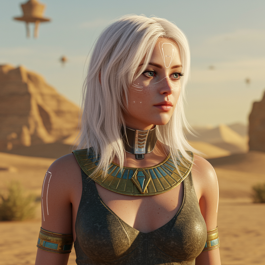 A young white woman with blonde hair stands in a futuristic desert landscape. Her features are brought to life in hyperrealistic detail, captured with an 85mm lens, in 8k resolution. Cinematic lighting envelops her, highlighting the intricate textures and luminous quality of her skin and hair. The image showcases an impressive depth of field with every detail finely focused, drawing inspiration from the art styles of Artgerm, Greg Rutkowski, and Alphonse Mucha. This sci-fi scene offers an oil painting-like aesthetic, blending realism with an imaginative twist. A hint of Egyptian influence adds an exotic flair, with the desert sun casting a warm glow, and shadows giving depth to her figure. The composition is artistic, capturing a serene yet otherworldly moment, devoid of imperfections and distractions such as blurry or disfigured elements. The overall tone is vivid but balanced, avoiding oversaturation and maintaining clarity throughout the scene.