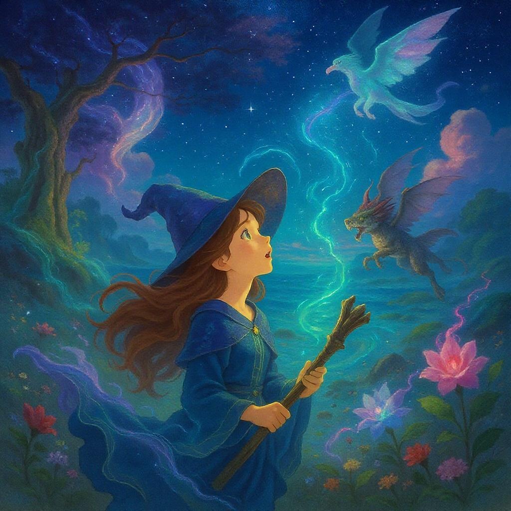 A young witch gazes in awe at the wonders of magic, in a world reminiscent of a Studio Ghibli film, captured in stunning detail at 8k resolution, showcasing vibrant colors and enchanting landscapes, as mystical creatures and swirling spells dance around her in a captivating display of fantasy.
