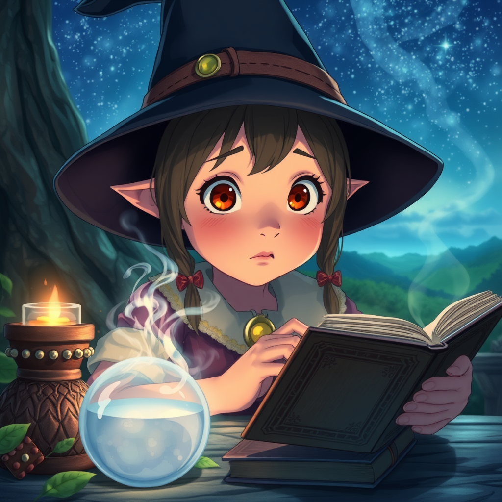 A young witch marvels at the wonders of magic, inspired by the whimsical style of Studio Ghibli, capturing the enchanting details in incredible 8k HD resolution. Set against a backdrop of lush landscapes and starry skies, she explores mystical potions and ancient spellbooks, her eyes wide with curiosity and amazement as the vibrant colors and gentle, dreamy atmosphere evoke a sense of wonder and adventure.
