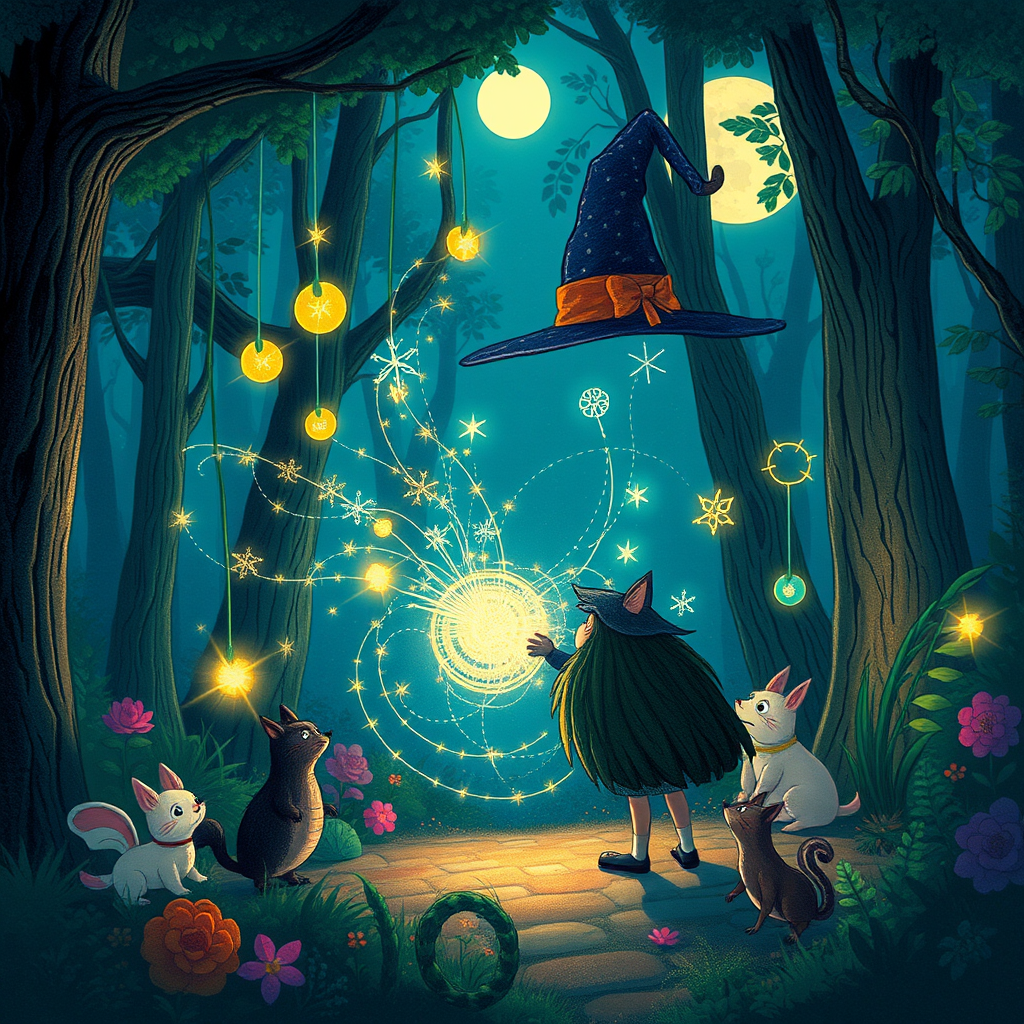 A young witch stands amidst a lush, enchanted forest, casting a mesmerizing spell that fills the air with shimmering, colorful lights. The scene is reminiscent of a Studio Ghibli film, with vibrant, hand-drawn elements and a sense of whimsy and magic. The little witch's eyes sparkle with excitement as swirling magical symbols dance around her, reflecting her boundless imagination and wonder. Forest creatures gather to watch, captivated by the spectacle, as the moonlight filters through the trees, adding a soft glow to the enchanting scene.