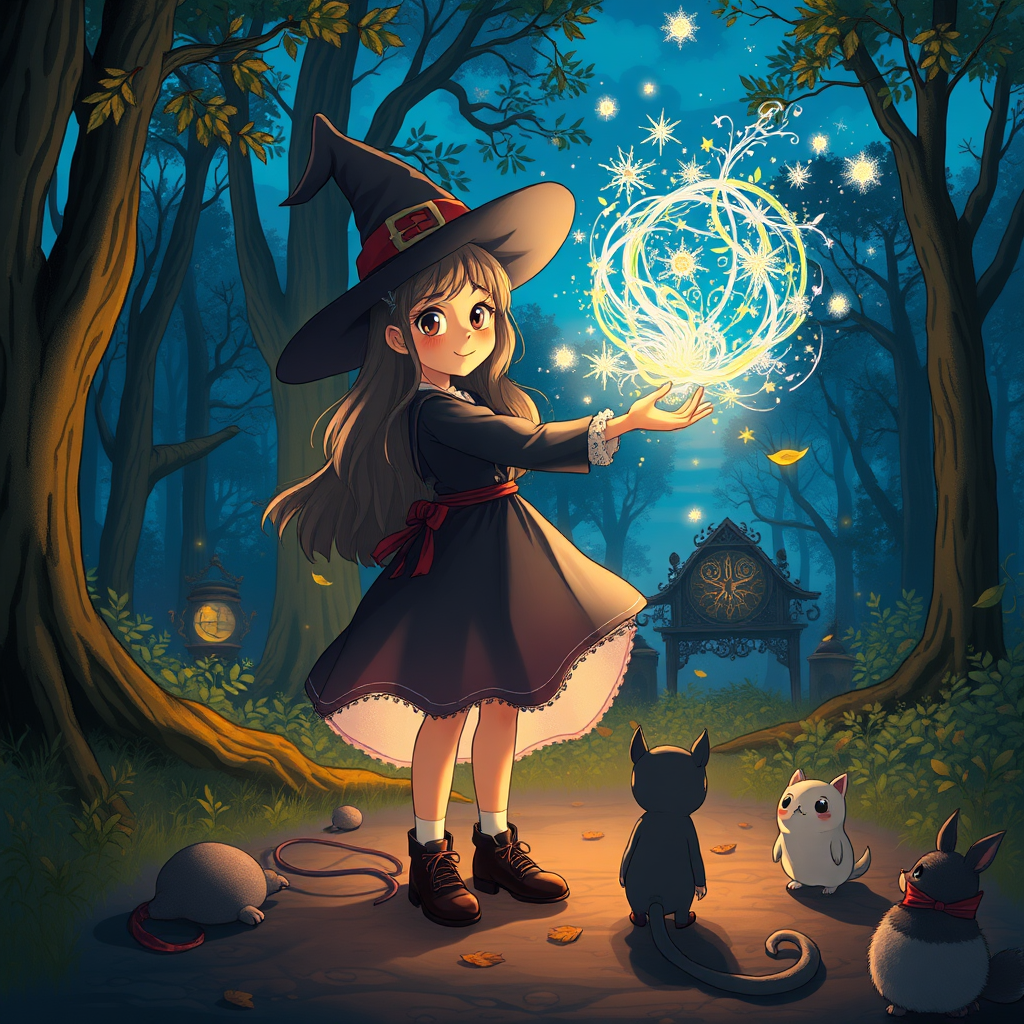 A young witch with twinkling eyes stands in a magical forest, casting a breathtaking spell that illuminates the evening sky with dazzling colors; her surroundings transform into a whimsical world reminiscent of a Studio Ghibli scene, with enchanted creatures curiously watching the spectacle, while a gentle breeze swirls fallen leaves around her, adding to the enchanting atmosphere.