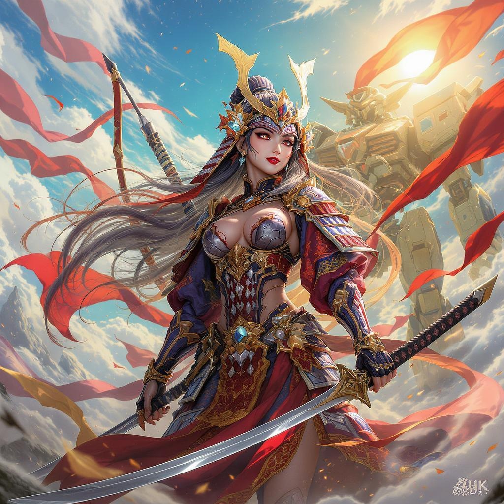 A young woman adorned in elaborate, futuristic samurai attire stands poised, gripping a gracefully arched saber samurai. The style is reminiscent of a cinematic movie poster with vibrant anime and manga influences, capturing both high detail and the vividness of offset printing. Behind her, ceremonial bows and fluttering flags accentuate an atmosphere of ancient tradition, while the silhouette of an antiquated mech looms in the sun-drenched background. The scene exudes a sense of joyous energy under natural lighting, awash with bright colors and rendered in stunning 8K HD quality.