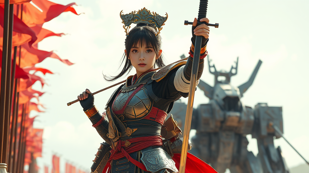 A young woman adorned in futuristic, intricately detailed samurai armor stands poised, her gleaming saber samurai raised with precision. Behind her, a majestic array of bows and fluttering flags unfurls against the sky. In the distance, the rusted silhouette of an ancient Mech looms, a testament to battles long past. The scene is bathed in warm, sunny weather, capturing the vibrant and dynamic energy of an anime with manga-inspired graphics. The colors are bright and engaging, reminiscent of offset printing in high detail. This cinematic movie poster captures an air of happiness and natural lighting, rendered in 8K, HD, CMYK. The composition is vertical at a 9:16 aspect ratio, offering an immersive glimpse into this imaginative world.