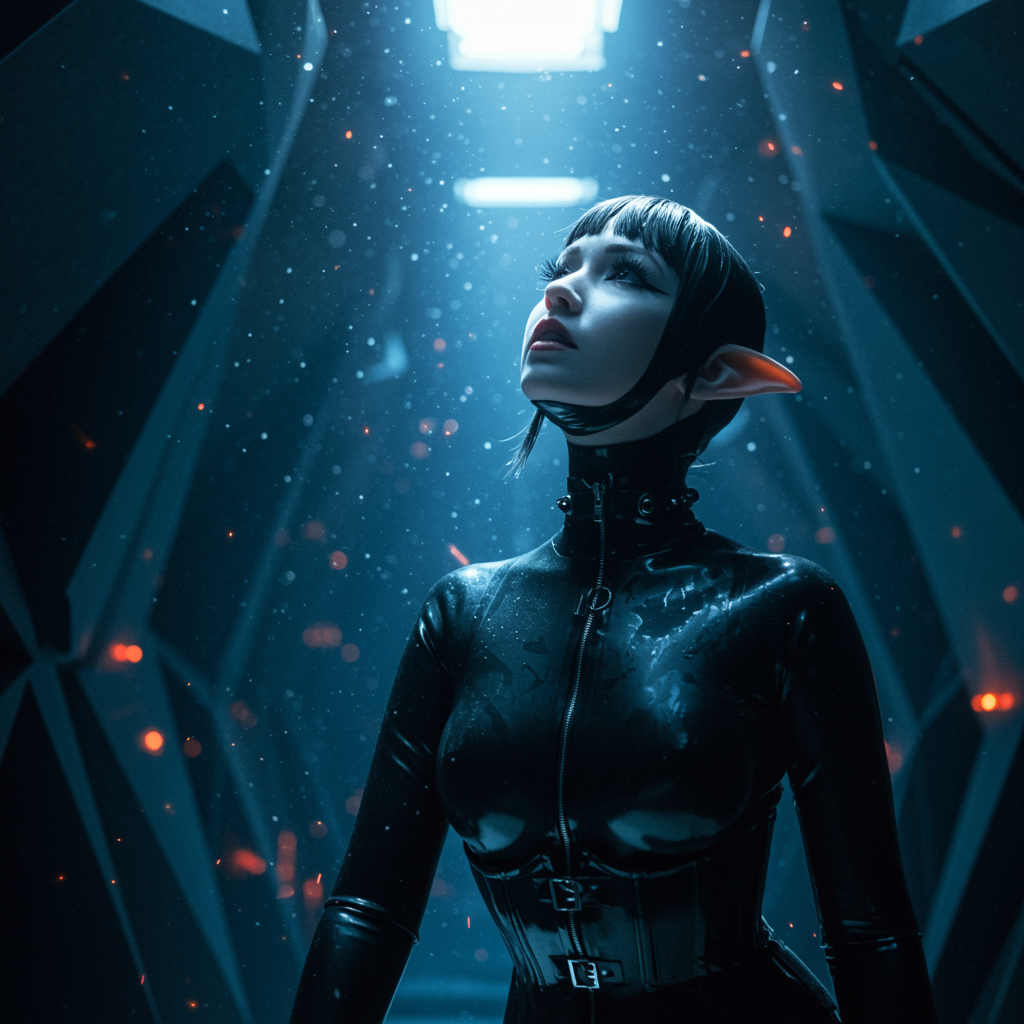 A young woman adorned in sleek, glossy latex gazes into a radiant light, reminiscent of Sandara Tang's style, where smooth curves merge with dark, explosive elements against a backdrop of poolcore and goblin academia. The scene is interwoven with sharp angles that contrast the shiny, reflective surfaces, imbuing a sense of mystical academia and daring exploration in a hidden, subterranean world.