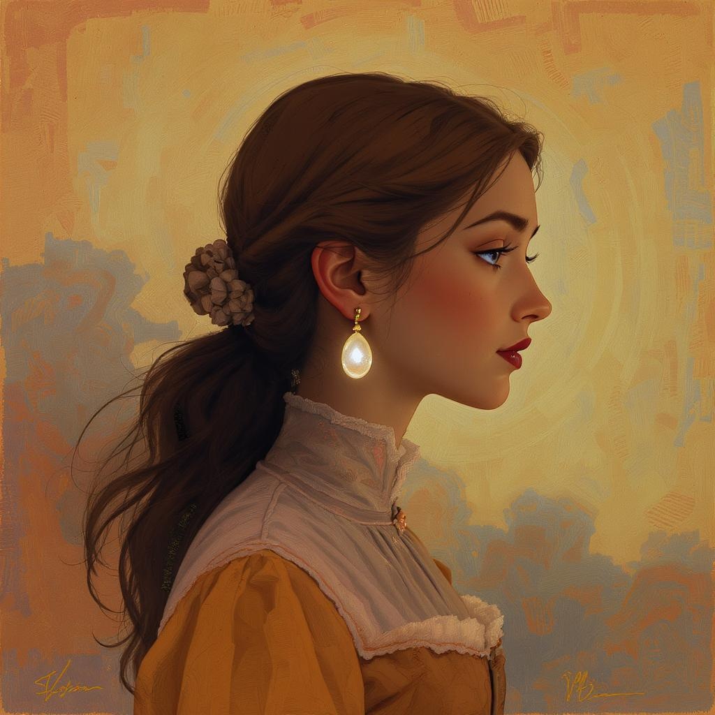 A young woman adorned with a luminous pearl earring, captured in a warm and rich color palette reminiscent of Jerry Pinkney's illustration style, with exquisite details in her expression and attire, set against a softly textured background that enhances the timeless and serene quality of the scene.