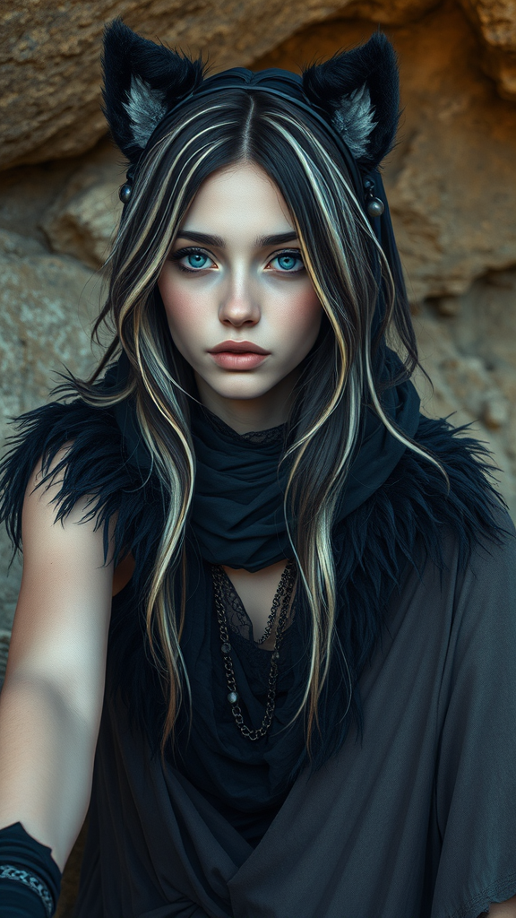 A young woman as a Greek priestess with streaked two-tone hair, reminiscent of plants, exuding a cold aura. She is set against the backdrop of the Nahal Me’arot / Wadi el-Mughara Caves, known for their significance in human evolution. The scene combines elements of cyber fairy grunge style. She is either lying down or sitting on someone’s lap, with captivating ice blue eyes. Her attire includes a gradient and highly detailed black-themed animal costume. The artwork resembles a one-piece character illustration with iridescence, inspired by Artstation. It is a portrait rendered in oil painting style, featuring an elaborate blend of artistic techniques, with unusual colors and slight blurriness adding to its surreal aesthetic. Despite these artistic choices, the composition maintains a sense of intrigue and mystery, creating a unique visual experience.