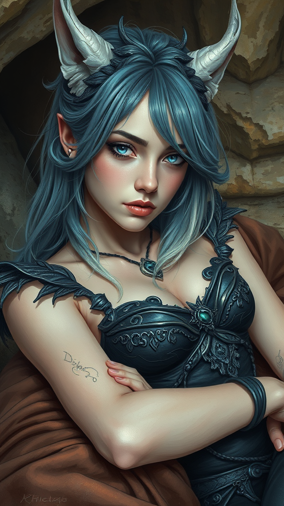 A young woman as a Greek priestess with streaked, two-tone, plant-like hair that suggests coldness. Set against the backdrop of the Nahal Me’arot / Wadi el-Mughara Caves, she embodies a cyber fairy grunge aesthetic. Her ice blue eyes shine with an iridescent quality as she lies down, resting on a lap. Her elaborate animal-themed costume features a detailed black one-piece, reminiscent of a character from an intricate narrative. The portrait, styled as a highly detailed oil painting, captures a blend of unusual colors with a gradient effect. Some minor imperfections add to the charm, with anatomy slightly distorted in a creative manner, contributing to the surreal atmosphere. The artwork, reminiscent of an Artstation illustration, melds elements of the fantastical and mythological with a touch of modern digital influence.