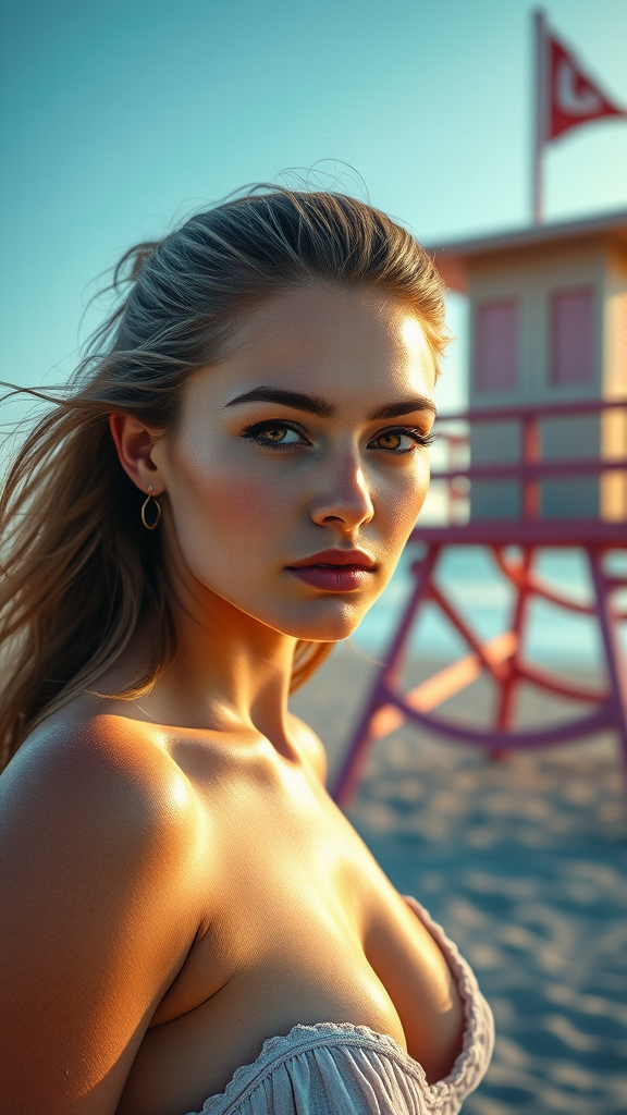 A young woman at the beach near a lifeguard tower, showcasing a toned physique and symmetrical eyes under dramatic lighting. The setting is realistic and captured in sharp focus, resembling a highly detailed photograph with hyperrealistic qualities, enhanced by ray tracing and physics-based rendering. This vibrant, high-resolution image displays intricate details and vivid colors, enhanced by thoughtful post-processing and color grading, creating a CG-like 8K quality wallpaper with rim lighting for added depth.