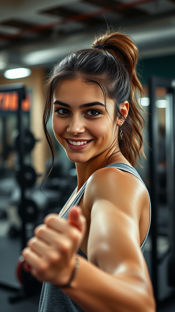 A young woman captures a candid moment in the gym, her expression a mix of determination and enthusiasm. The background showcases a variety of gym equipment, hinting at a vibrant and active environment. Soft lighting highlights her confident pose, while subtle shadows add depth to the scene, creating a dynamic and energetic atmosphere.