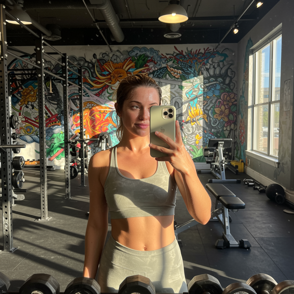 A young woman captures a selfie in a gym, her face glowing with a slight sheen of sweat, exuding determination and energy. She's clad in stylish workout gear, surrounded by weights and exercise equipment. Sunlight filters through large windows, casting dynamic shadows across the room, highlighting her toned physique and the vibrant mural behind her. Her hair is pulled back in a practical yet chic ponytail, and her expression is one of confidence and focus. The atmosphere is vibrant and full of motivation, capturing a moment of personal triumph and strength.
