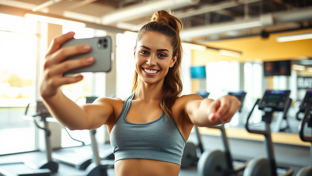 A young woman capturing a selfie at a brightly lit gym, glowing with energy and enthusiasm, her fitness attire reflecting a confident and determined attitude, surrounded by state-of-the-art exercise equipment and a motivating atmosphere.