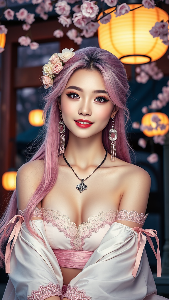 A young woman, capturing the essence of a K-pop idol, exudes elegance in her upper body portrait. She bears a striking resemblance to Yae Miko, with her signature pink, flowing long hair and distinctive bare shoulders accentuated by detached sleeves. Her attire reveals a mix of traditional and modern, featuring open clothes with intricate ribbon trim. She wears exquisite jewelry and earrings that highlight her captivating purple eyes. Set against a background of east Asian architecture, she sits amidst torii gates and cherry blossoms illuminated by lantern light, creating a mystical ambiance. Her skin appears radiant and shiny, enhancing the detailed focus on her smiling face. The setting is enriched by the depth of field, highlighting her nontraditional miko style amidst an enchanting landscape.