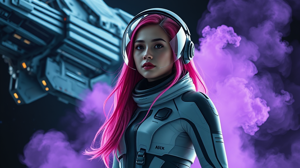 A young woman clad in a sleek, futuristic space suit stands alone against the backdrop of a massive spaceship. Her bright pink hair cascades down, contrasting vividly with the deep space setting. A swirl of mysterious purple smoke envelops her, lending an air of mystery to the scene. The entire composition is captured with a photorealistic touch, bathed in cinematic lighting that highlights sharp reflections on her visor. Rendered with the precision of Unreal Engine 5, the scene conveys a sense of wonder and solitude in the vastness of space.