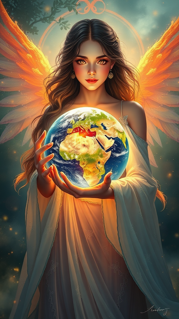 A young woman clad in an ethereal gown cradles a luminescent globe, embodying an earth goddess of mythical lore in a realistic fantasy style. Her serene gaze reflects the vivid vibrancy of a living planet, each continent and ocean meticulously detailed. Her flowing attire shimmers with the colors of dawn, blending seamlessly into the surrounding elements of nature, as if she herself is part of the world she holds. The artwork is a harmonious blend of anime and realistic fantasy, inspired by the styles of Artgerm, Atey Ghailan, and Guweiz, capturing the breathtaking beauty and mysticism of a nature deity through stunning digital brushwork and ethereal, dream-like hues.