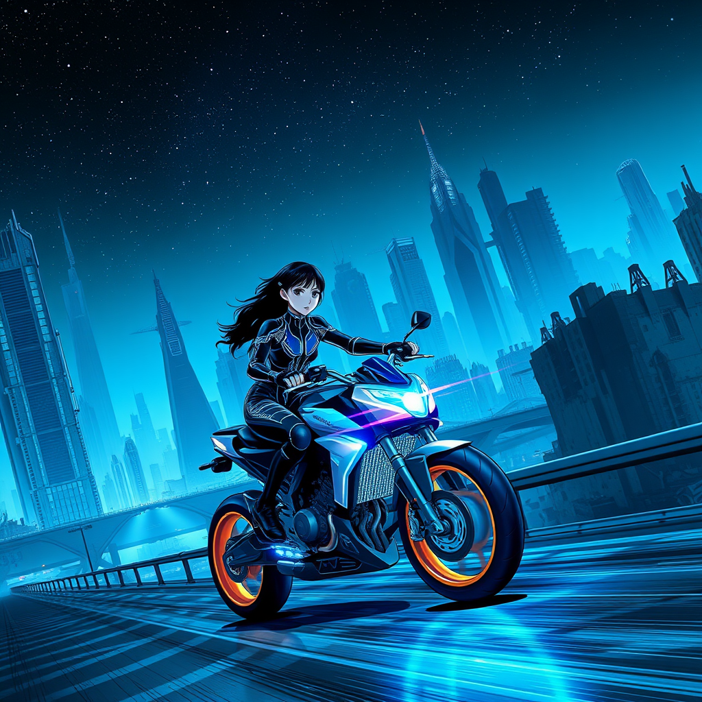 A young woman clad in an intricate, form-fitting sci-fi jumpsuit races her neon-lit, futuristic motorcycle across an expansive bridge, set against the backdrop of a desolate sci-fi metropolis dominated by towering, crumbling skyscrapers. The scene is enveloped in an atmosphere reminiscent of Akira and Tsutomu Nihei's works, capturing the sense of gigantism and otherworldliness. The cityscape is marked by remnants of advanced architecture, while the sky sparkles with stars, casting a subtle glow over the dystopian setting. Her motorcycle emits vibrant blue energy plumes, illuminating the surroundings in a mesmerizing neon light. The artwork merges manga-inspired graphics with a gritty, dark exposure, emphasizing blue tones. This high-quality, highly detailed anime drawing is captured from a first-person view in 8K Full-HD, bursting with plasma energy and a stark contrast between shadows and light in a futuristic universe.