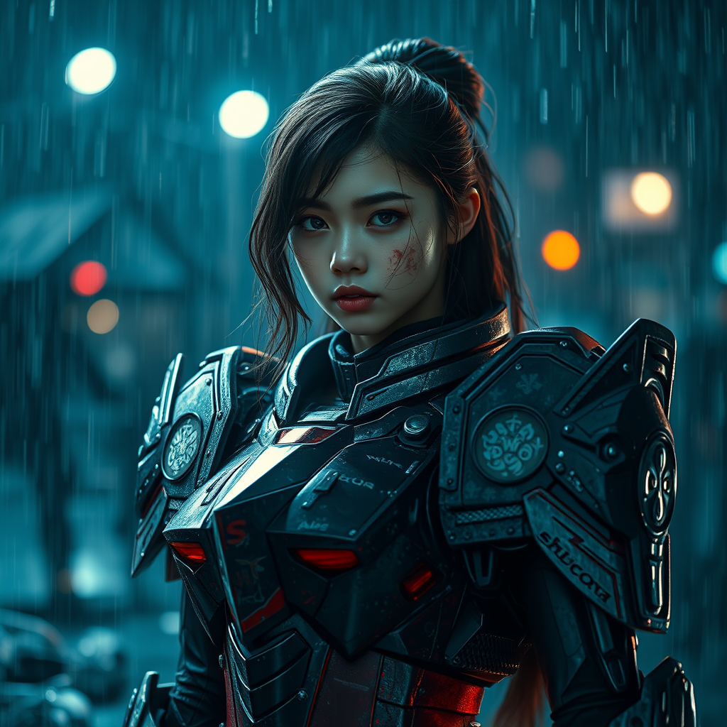 A young woman clad in battle-scarred Gundam-inspired armor stands amidst a dark, rain-soaked night, surrounded by the remnants of an epic skirmish. Her detailed face tells a story of resilience as she bears the wounds of battle, with her exquisite armor glistening under cinematic lighting. The scene is a masterpiece of photography, capturing a stunning and surreal environment that merges the divine with the celestial. Rich in manga and anime aesthetics, the atmosphere brims with intricate details and vibrant color, enhanced by hyperrealistic focus and lumen reflections. Despite the chaos, her visage remains the focal point, overshadowing minor imperfections like missing fingers or extra digits, creating a sense of otherworldly beauty amidst a deformed, shifting backdrop. The composition exudes an ethereal elegance, free from distracting elements such as watermarks or disfigurations, achieving an artful balance between chaos and elegance.