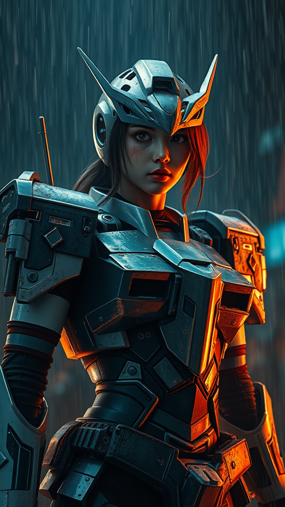 A young woman clad in battle-worn Gundam armor stands defiant amidst the rain-soaked chaos of a dark night. The armor, a testament to an epic fight, bears the marks of valor and conflict. Her face, exquisitely detailed, tells a story of resilience and determination despite her wounds. The scene is rendered with cinematic mastery, capturing an otherworldly environment that is both surreal and divine. The shiny, smooth surfaces of her armor reflect the ambient light, creating a celestial aura around her. This hyperrealistic portrayal, infused with vibrant manga-style colors and intricate details, evokes a powerful atmosphere. Lumen reflections dance across the scene, enhancing the dramatic composition of this stunning photographic masterpiece.