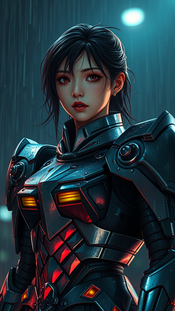 A young woman clad in battle-worn Gundam-inspired armor stands amidst a dark, rain-laden night, embodying the aftermath of a fierce battle. Her armor, a fusion of metallic strength and celestial grace, glints subtly under the cinematic lighting, reflecting vibrant splashes of color from her surroundings. Her face, marked by the intensity of the clash, displays intricate emotions and hyperrealistic details, capturing a blend of resilience and ethereal beauty. The environment around her is a stunning, surreal blend of shadows and light, creating a divine atmosphere that feels both manga-inspired and lifelike. Shiny rain droplets glide smoothly over her armor's surface, accentuating its intricate design and adding to the sense of a masterpiece in motion. The scene is filled with an epic sense of scale and wonder, showcasing a hyper-focused, photogenic moment where every detail contributes to the storytelling—a celestial battlefield where her wounded valor shines through in a vibrant, anime-esque tableau.