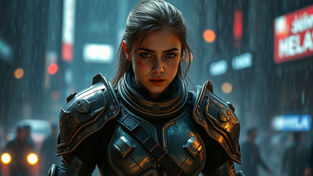 A young woman clad in futuristic armor stands amidst the chaos of a dark, rainy night. Her battle-damaged armor glistens under the cinematic lighting, reflecting the fierce conflict she has endured. The epic fight scene unfolds around her, with the atmosphere charged and electric. Wounds from battle mark her determined face, revealing intricate details of her fierce resolve and strength. The environment is stunning, with hyperrealistic elements that bring the scene to life. Lumen reflections dance across the rain-soaked surfaces, enhancing the focus on her tenacity. This photographic masterpiece captures both the intensity and the beauty of the moment, all within a richly detailed and intricately crafted setting.