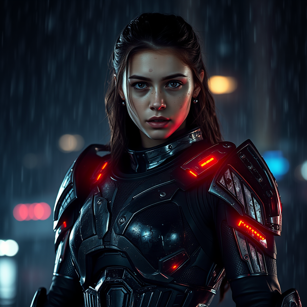 A young woman clad in futuristic armor stands defiantly amidst a dark, rainy night, her battle-damaged suit glistening with lumen reflections. The scene captures the aftermath of an epic fight, her expression determined yet visibly marked by the wounds of battle. Her face is detailed with intricate precision, portraying a mixture of grit and resilience. The environment is stunningly atmospheric, with a hyperrealistic focus on the cinematic lighting that highlights each bead of rain and cast shadow. The background is a blend of chaos and beauty, creating a masterpiece of photography that captures the essence of relentless struggle and unyielding strength in a breathtaking and detailed composition.