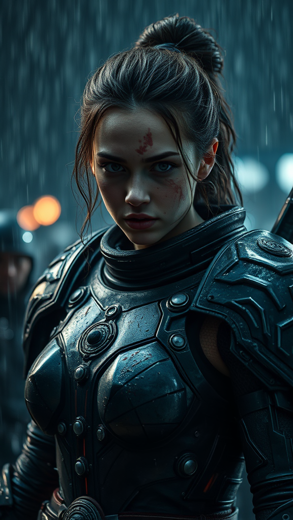 A young woman clad in futuristic battle-damaged armor stands amidst a dark, rainy night. She is caught in the midst of an epic fight scene, wounds from battle evident on her intricate, detailed face. The scene is a cinematic masterpiece, with stunning hyperrealistic photography capturing the intense atmosphere. The environment around her is richly detailed, with cinematic lighting casting focused, dramatic shadows and brilliant lumen reflections off the rain-soaked surfaces, creating an immersive and breathtaking visual narrative.