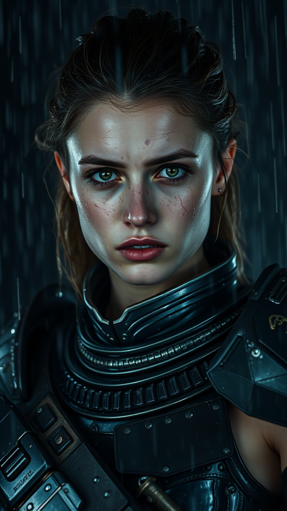 A young woman clad in futuristic, battle-worn armor stands resilient in the pouring rain of a dark night, her face marked by signs of an epic battle. The detailed features of her face reveal both determination and exhaustion, each scratch and scar telling a story. The scene is captured with cinematic brilliance, the atmospheric lighting highlighting the intricate details of her armor. Raindrops create a symphony of reflections and patter against the metal, adding to the hyperrealistic quality of the moment. The environment around her is both stunning and haunting, a masterpiece of photographic art that captures the intense focus of the unwavering warrior amidst the chaos.