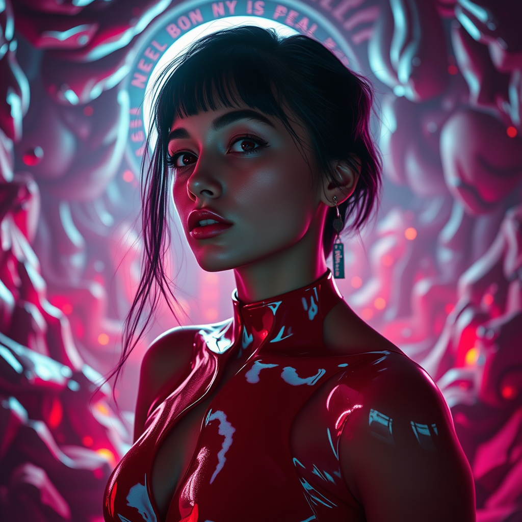 A young woman clad in glossy latex gazes intently towards the radiant glow, her figure highlighted by smooth curves and dynamic, explosive contrasts. The atmosphere is a fusion of poolcore aesthetics and goblin academia, with sharp angles and a polished, shiny finish. Her surroundings hint at an intricate, surreal landscape filled with vivid, contrasting elements that evoke both mystery and modern allure.