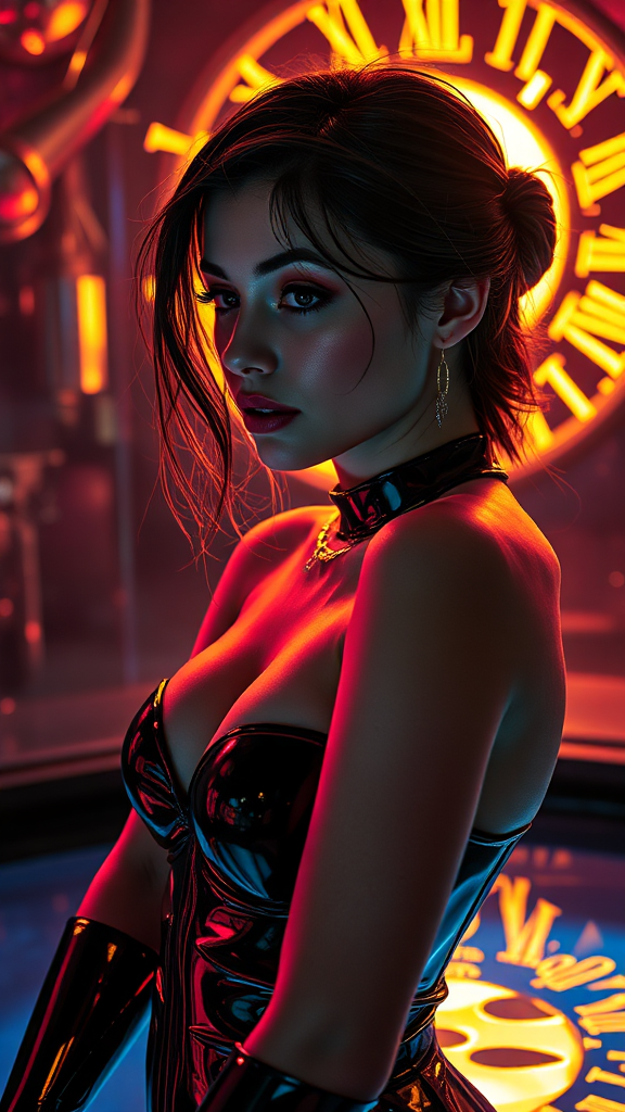 A young woman clad in glossy latex gazes into a luminous glow, her form accentuated by smooth curves and sharp angles. The scene is infused with a dark and explosive energy, reminiscent of poolcore aesthetics and goblin academia, capturing an otherworldly allure. Rich, reflective surfaces create a sense of depth, while the setting's intricate details echo an ethereal, vibrant mystique in the style of sandara tang.
