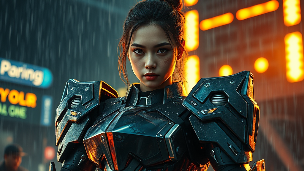 A young woman clad in Gundam-inspired armor stands defiantly amidst a stormy, rain-soaked night. Her armor bears the scars of an intense battle, with intricate details that highlight the craftsmanship and the toll of the fight. She is wounded but resilient, her face captured with extreme detail, exuding strength and determination. The scene is a cinematic masterpiece, set in a stunning environment that gleams with divine, celestial energy. The shiny, smooth surfaces of her armor reflect the surreal, hyperrealistic atmosphere, imbued with rich colors and dramatic, focused lighting. Despite the epic setting, there are intriguing imperfections—slight distortions in anatomy, suggesting the relentless nature of the battle. Her pose conveys a sense of motion, hinting at a fierce struggle, while elements of manga and anime add character to the scene. The composition is a vivid tapestry of light and shadow, drawing the viewer into a cinematic, otherworldly experience.