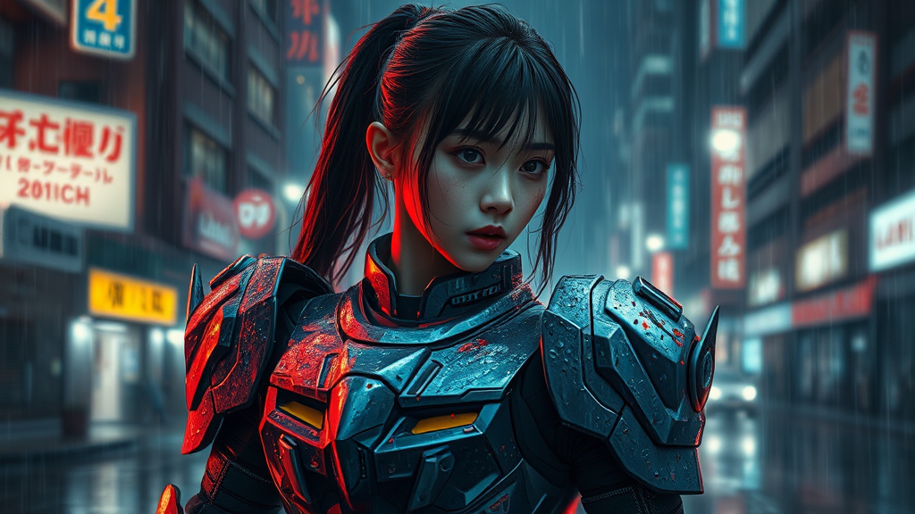 A young woman clad in Gundam-inspired armor stands amidst a battle-ravaged urban landscape, her armor showing signs of damage from a fierce conflict. It's a dark, rainy night, the environment filled with an epic, cinematic atmosphere. Raindrops cascade down her intricate armor, reflecting ambient street lights that lend a surreal, shiny shimmer to the scene. She is wounded, yet resolute, her face detailed with expressions of determination and resilience, captured in hyperrealistic detail. The environment around her is stunning, a mix of celestial and divine elements that enhance the atmospheric intensity. The rain adds an extra layer of depth, its lumen reflections dancing across the scene, bringing out a kaleidoscope of colors. The lighting is dynamic and dramatic, wrapping the fight scene in a vivid, manga-inspired aesthetic. This moment is intricately detailed, a smooth and surreal blend of anime and reality, frozen in time like a photographic masterpiece.