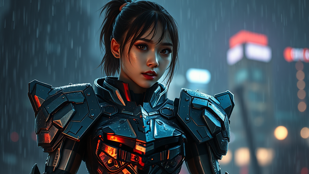 A young woman clad in Gundam-inspired armor stands resilient amidst a dark, rain-soaked night, her battle-damaged suit telling tales of an epic confrontation. Raindrops cascade over her intricate, shiny armor, reflecting the luminous glow of distant city lights in a surreal, celestial atmosphere. Her face, wounded yet determined, is captured with hyperrealistic detail, every emotion vividly portrayed. The scene is a cinematic masterpiece, with vibrant colors and intricate details highlighting the stunning, divine environment around her. Manga and anime influences are evident in the smooth, polished design of the armor and the dynamic pose, creating a vivid, atmospheric tableau. The dramatic lighting and focused lumen reflections add depth and intensity to this extraordinary, breathtaking moment.