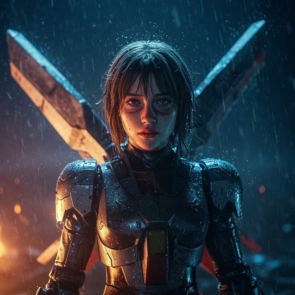 A young woman clad in Gundam-inspired armor stands resolute, her battle-damaged suit glistening under the pouring rain of a dark, stormy night. The scene captures an epic fight, her face detailed and expressive, revealing the toll of the battle. Despite her wounds, there's an ethereal strength in her presence. This high-resolution cinematic masterpiece boasts stunning environments that blend shiny, smooth, and surreal elements, creating a divine and celestial atmosphere. The anime and manga influences are clear, and the scene bursts with color and intricate details. The impeccable cinematic lighting enhances the hyperrealistic focus, with reflections adding depth. Although the scene embodies perfection, subtle imperfections—such as textural errors, and artistic quirks like extra or fewer digits—lend character. This hyper-detailed yet imaginative work captures the beauty and chaos of the battleground, drawing viewers into its intense, atmospheric narrative.