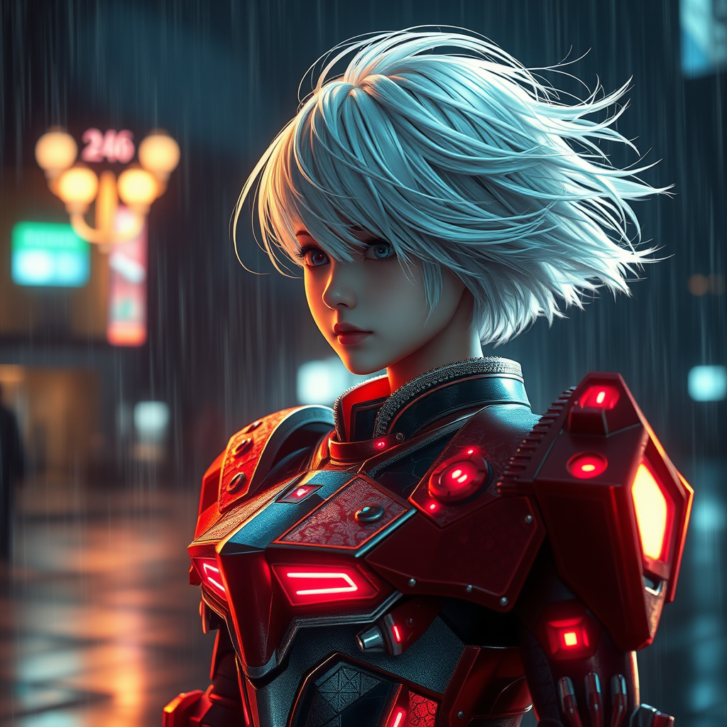 A young woman clad in intricate Gundam armor stands alone, her short white hair swept by the wind on a dark, rainy night. The scene is captured in a stunning, cinematic masterpiece, trending on ArtStation. Every detail is meticulously rendered, highlighting the surreal and divine qualities of the setting. The environment glows with vibrant colors and atmospheric lighting, enhanced by lens flares and reflections. The hyperrealistic CGI, crafted in Unreal Engine 5, creates a breathtaking, otherworldly feel. The girl's expression is focused and intense, in an art style reminiscent of anime and manga. The overall composition is a striking blend of photography and 3D rendering, capturing an intricate, colorful, and atmospheric scene that radiates with cinematic brilliance.