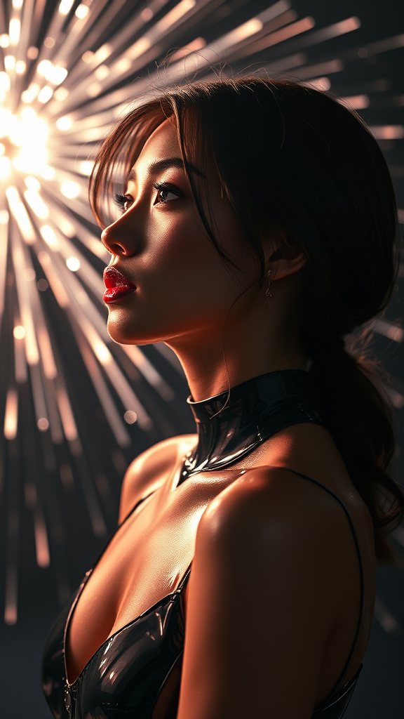 A young woman clad in sleek latex gazes toward a shimmering light, crafted in the style of Sandara Tang. Her form is defined by smooth curves and sharp angles, creating a contrast that brings life to the dark and explosive ambiance around her. The environment embodies a fusion of poolcore aesthetics and goblin academia, where glossy surfaces reflect fragmented light, casting intricate patterns. Her silhouette is both mysterious and compelling, as the glossy latex captures the gleam of her surroundings, producing a vivid, almost otherworldly allure.