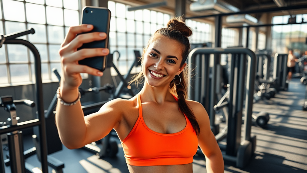 A young woman confidently snaps a selfie at a bustling fitness center, her expression a blend of focus and determination, as sunlight streams through the large windows, casting dynamic shadows on the sleek gym equipment around her. Her vibrant workout gear contrasts with the industrial aesthetic of the space, while the lively environment buzzes with energy and the sound of clanging weights fills the air.