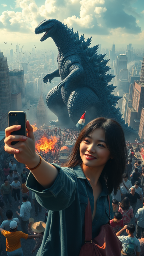 A young woman confidently takes a selfie amidst the chaos, in the background towering Godzilla wreaks havoc on a sprawling cityscape, crowds of people flee in terror, captured in a photorealistic style reminiscent of Beeple with a touch of Studio Ghibli's whimsical charm. The scene is dramatic yet surreal, capturing the contrast between the woman's calm demeanor and the pandemonium unfolding behind her.