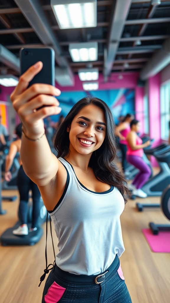A young woman confidently takes a selfie in a vibrant gym, surrounded by sleek exercise equipment and energetic individuals, her expression beaming with motivation and positivity. She wears stylish athletic gear that complements the dynamic atmosphere, capturing the moment of her fitness journey with enthusiasm and strength.